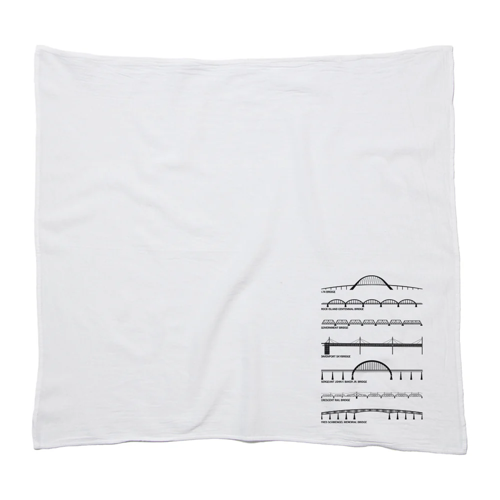 Bridges of The Quad Cities. Black Screen Print on a 28" x 29" flour sack kitchen towel.